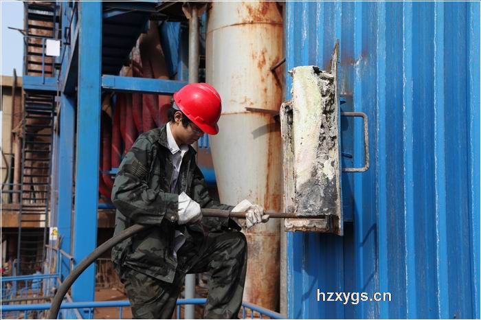 全副武裝的工人師傅鉆入電除塵清灰