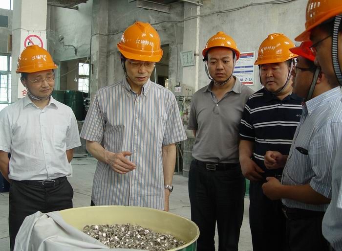 省國資委黨委副書記何少華(左二)集團組織部長汪小明(左一)聽取金屬鈣產品介紹