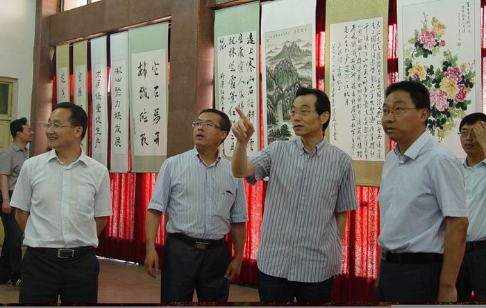 省國資委黨委副書記何少華(左三)集團組織部長汪小明(左一)參觀職工書畫展品